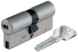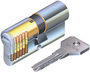 Цилиндар са дворедим тачкастим кључем и 10 пинова од којих је са доње стране први од каљеног челика. Као додатну заштиту од бушења има челичну чивију. Уз цилиндар се добија и код картица.